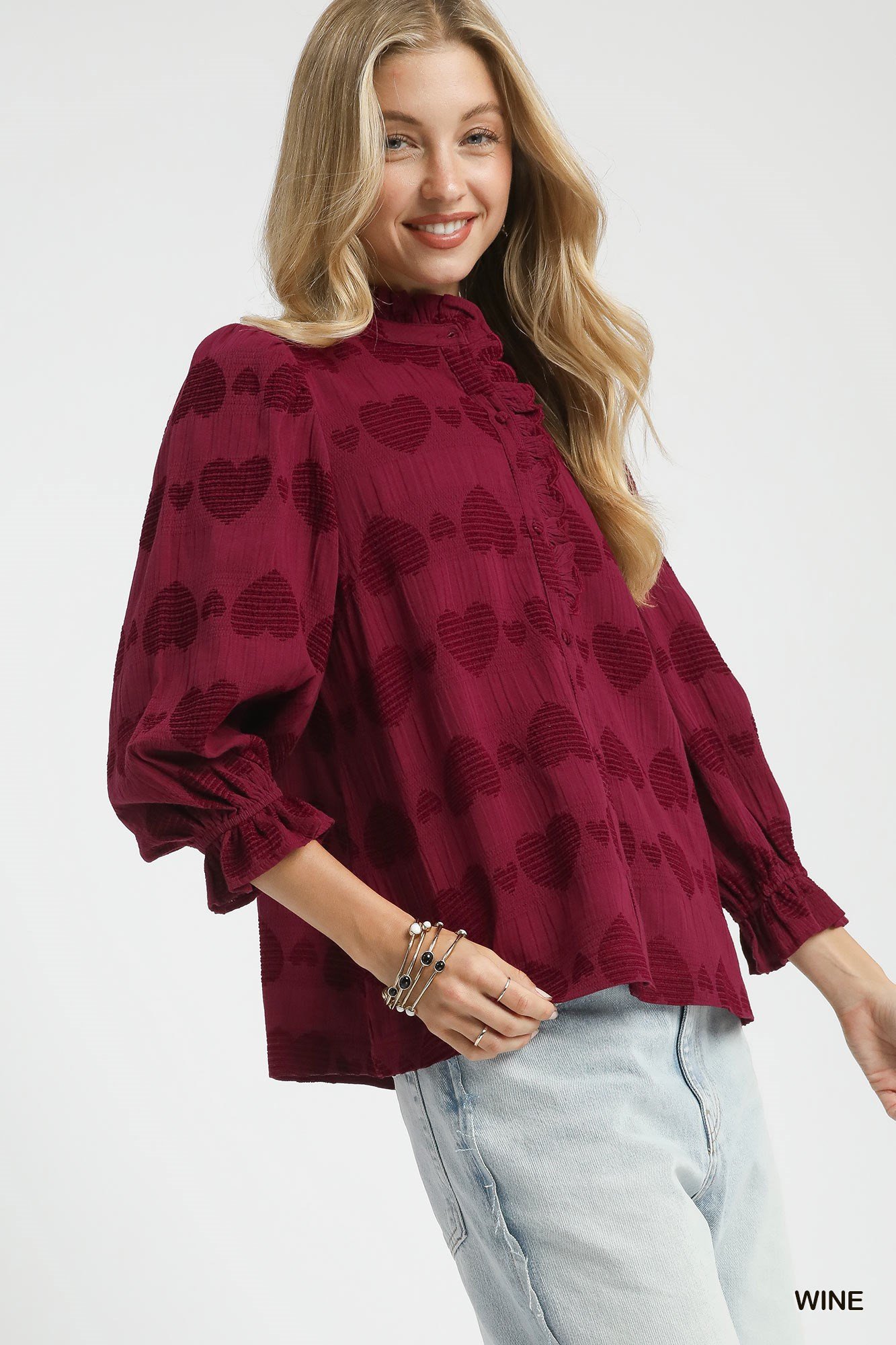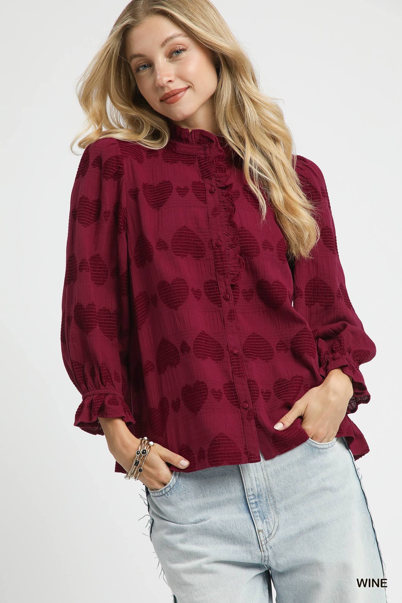 Umgee USA Umgee Heart Jacquard Ruffle Trim Shirt